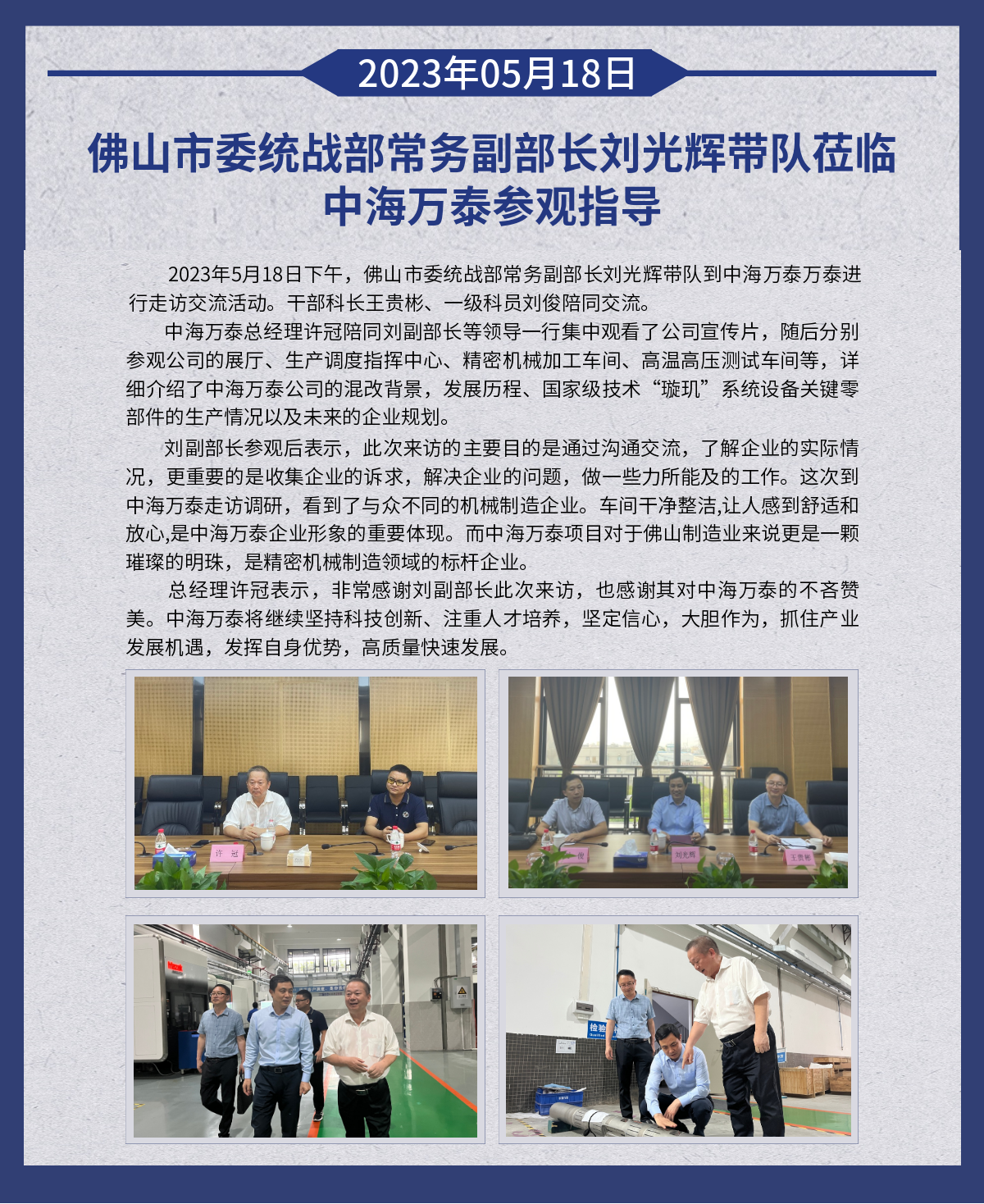 2023年5月18日 佛山市委統(tǒng)戰(zhàn)部常務(wù)副部長劉光輝帶隊(duì)蒞臨中海萬泰參觀指導(dǎo)